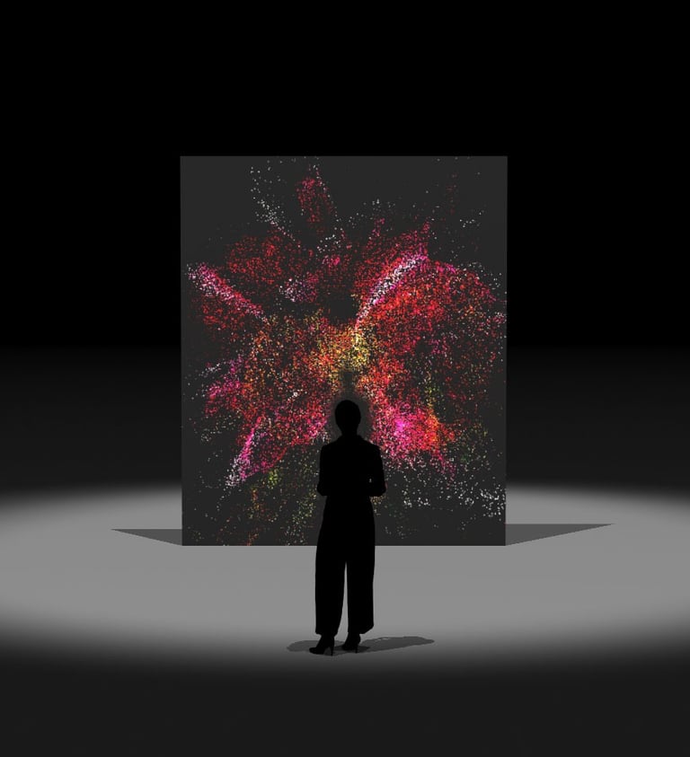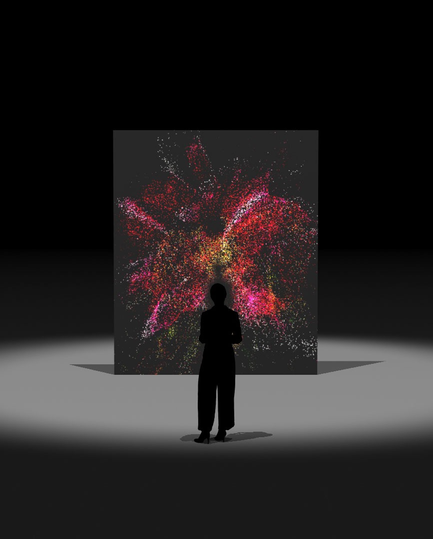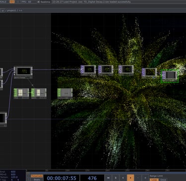 The installation features real-time visuals of natural elements like plants and flowers. By using creative coding techniques, these visuals transform into particles connected to motion sensors. As spectators move and interact with the sensors, their movements transform and decompose the visuals. This dynamic process is accompanied by sound design that sonically represents the concepts of decay and decomposition.
